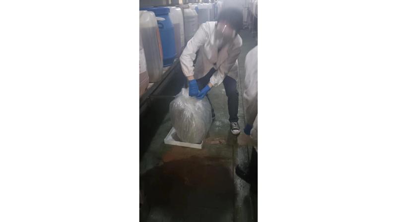 演练模拟危废中转站内,盛装废化学试剂的容器发生渗漏,腐蚀性废液向地面扩散。现场学生立即停止操作、做好防护并报告情况;带队教师迅速启动预案,设置警戒、疏散人员,同时上报学校应急小组。